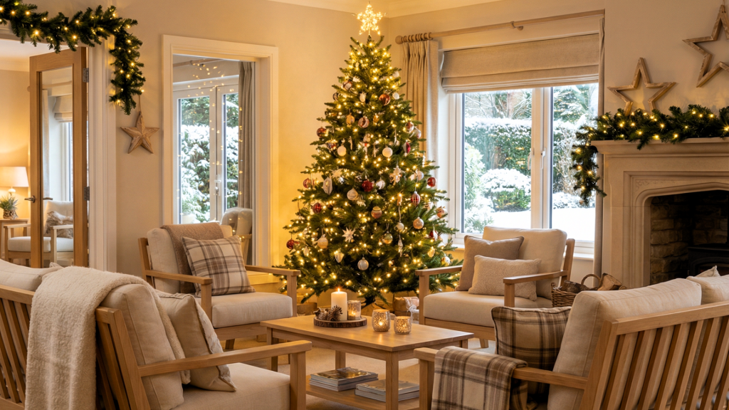 Im Foyer begrüßt Sie ein großer Weihnachtsbaum mit bunten Kugeln und liebevoll gebastelten Anhängern. Rundherum laden gemütliche Sitzgruppen und Lounge-Inseln zum Verweilen ein. Die Tische sind mit Tannenzweigen dekoriert, an den Fenstern leuchten Sterne.